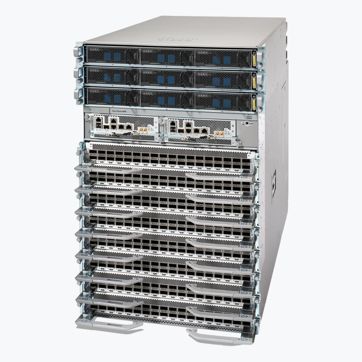 The Cisco Nexus 9800 Series expands the Nexus 9000 Series portfolio with high-density, high-speed modular switches designed for modern data centers. The N9K-C9808 is a 16-RU modular chassis with 8 line card slots, supporting very high-speed and port-density line cards.